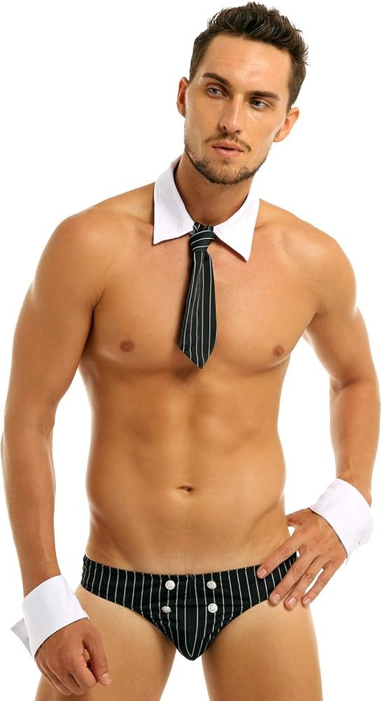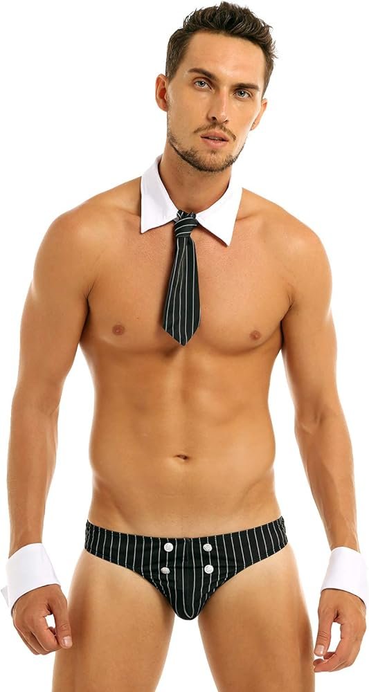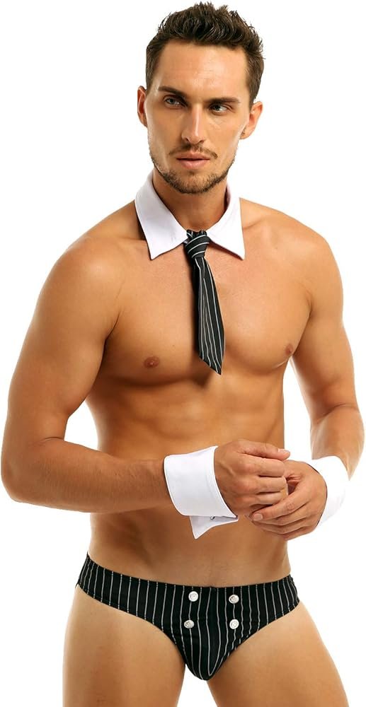 El juego incluye: 1 tanga para hombre, 1 collar, 1 corbata, 1 par de pulseras.